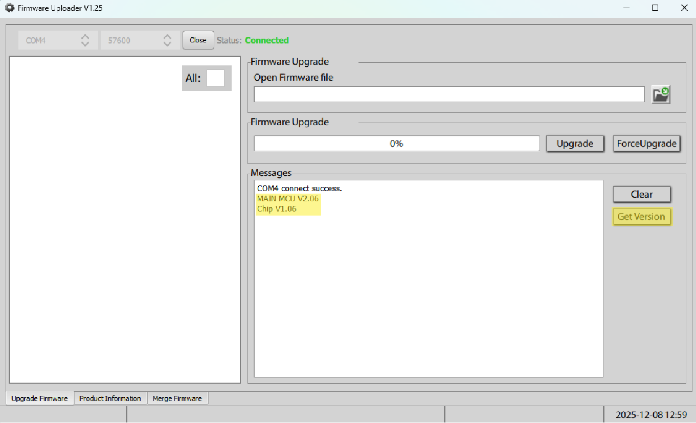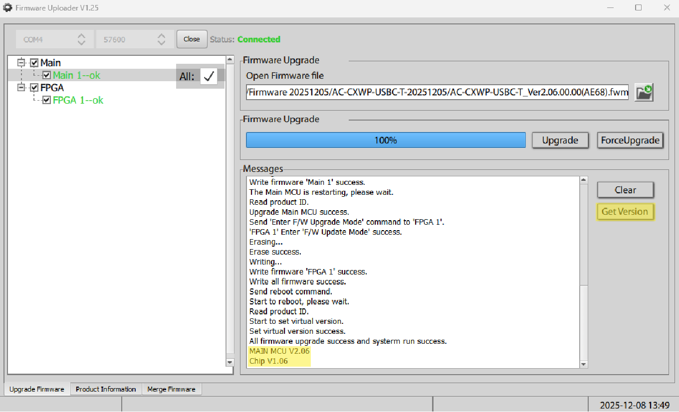 7. Once the loading bar reaches 100%, use the Get Version button again to ensure the new firmware version is correct (note: screenshot below is only an example and may not display the exact version).