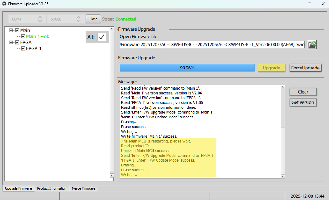 6. Select the Upgrade button to start the firmware update. The loading bar will pause at 99% for a few seconds before automatically rebooting the unit. Do not use the ForceUpgrade button. If the Uploader is not updating firmware for any reason, please contact AVPro Edge Tech Support for assistance with troubleshooting your AC-CXWP-USBC-T.