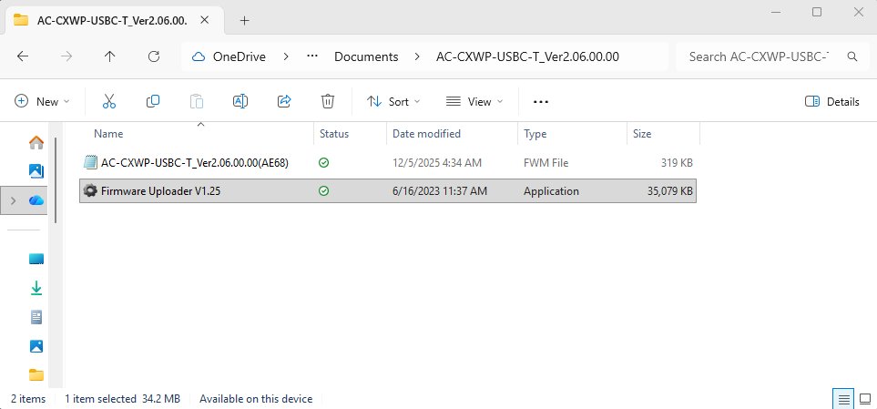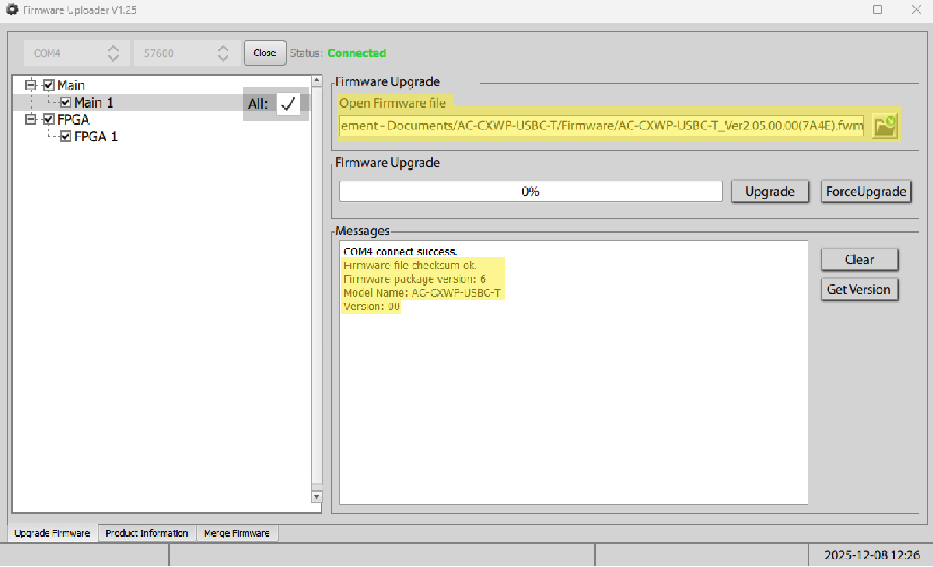 4. Select the Get Version button to see the current firmware version on the AC-CXWP-USBC-T (note: screenshot below is only an example and may not display the exact version).