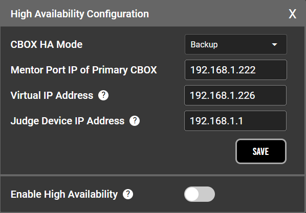 - The Backup CBOX is now configured and the pop-up can be closed by clicking the X on the bottom right. The High Availability section will have changed, indicating configuration was successful.