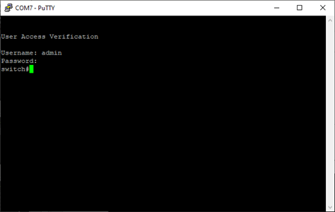 4. Open the session using your terminal program, then press the Enter key. The server will respond with "User Access Verification" followed by a prompt for the "Username". This indicates that successful communication with the SW12 is now established.