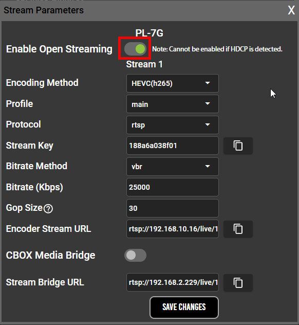 - Turn the CBOX Media Bridge toggle switch to the ON position and click Save Changes. The pop-up window will close. Reopen it and continue to the next step.