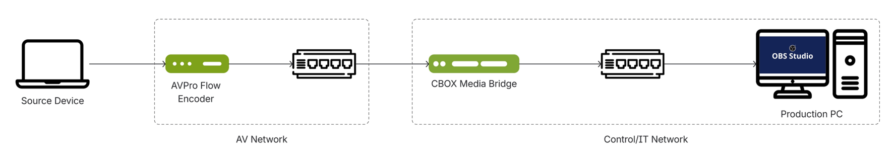 The CBOX Media Bridge allows AV streams to cross between the AV LAN and Control/IT LAN. The CBOX acts as a mediator and translates streams between subnets, simplifying network topologies and 3rd-party device interoperability.