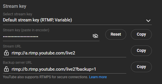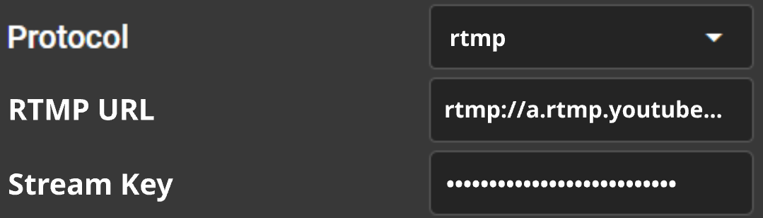 - Choose RTMP as the protocol and paste both the RTMP URL and Stream Key from the streaming service into the respective fields.