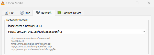 - Take the copied URL and insert it into the 3rd-party device software configuration. Here is an example of decoding the stream with VLC Media Player.