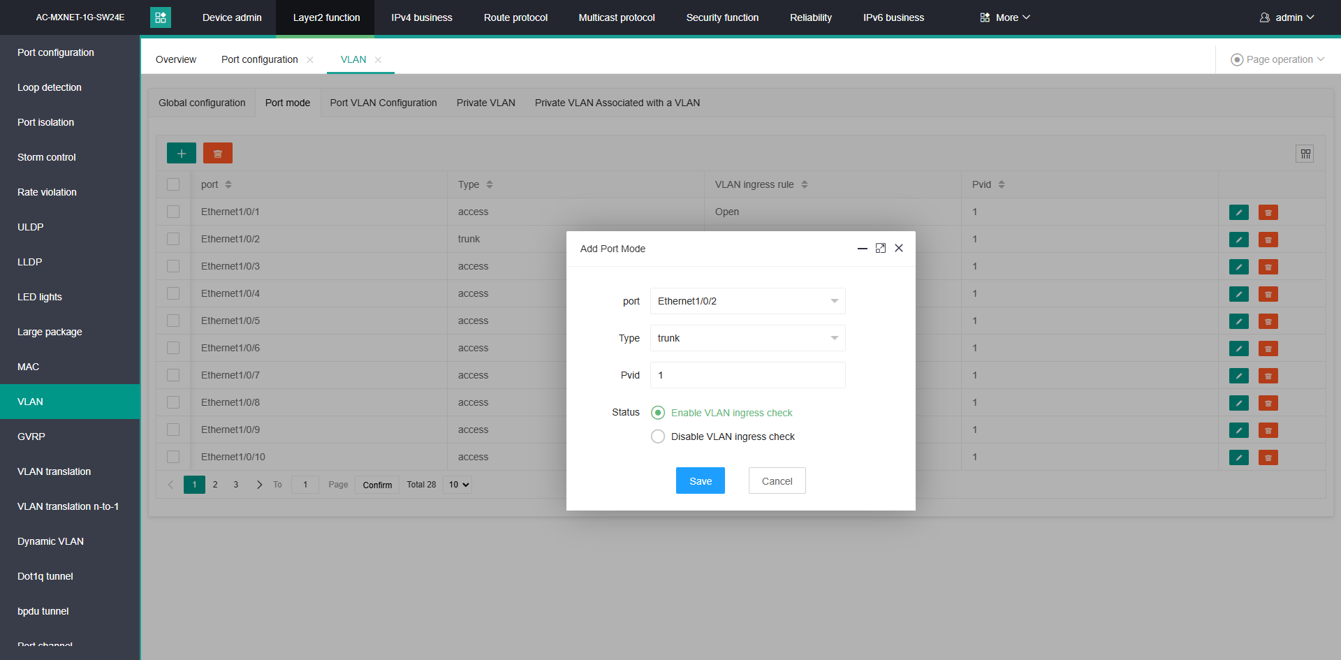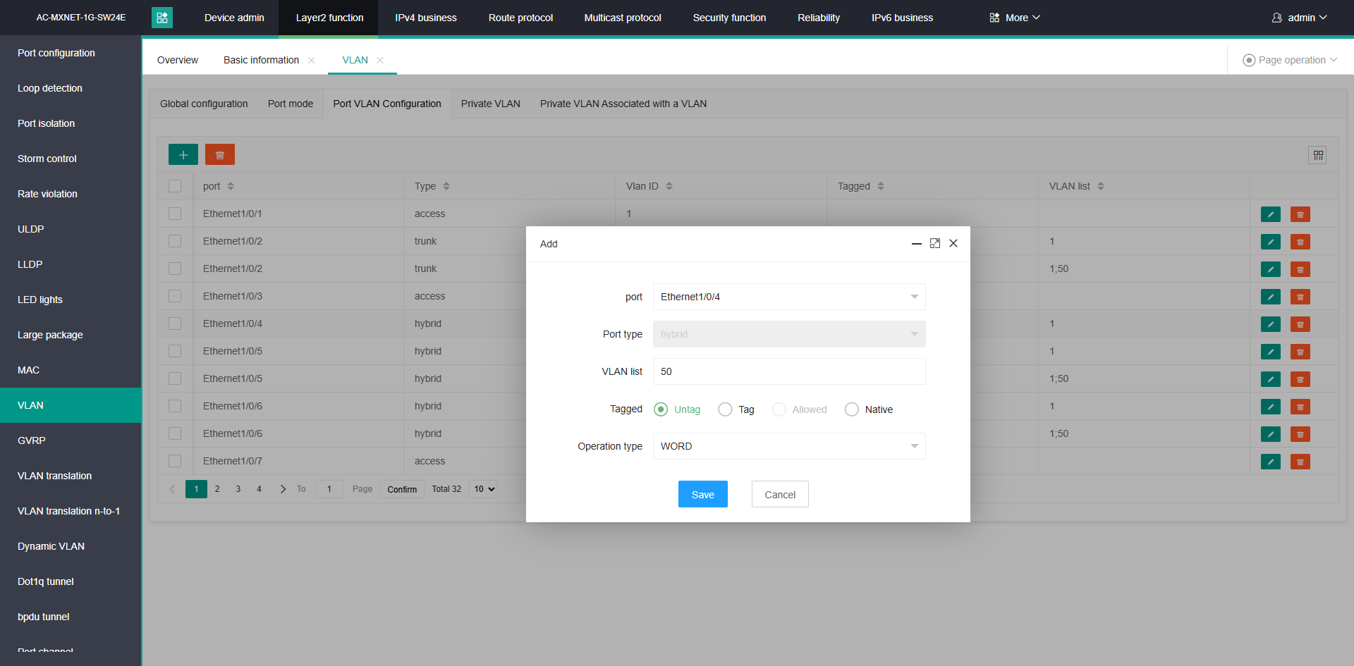 Once complete, the modified switchports will look similar to the below image, with the 'Native' column containing the MXnet VLAN, and the 'untag' column containing the Dante VLAN.
