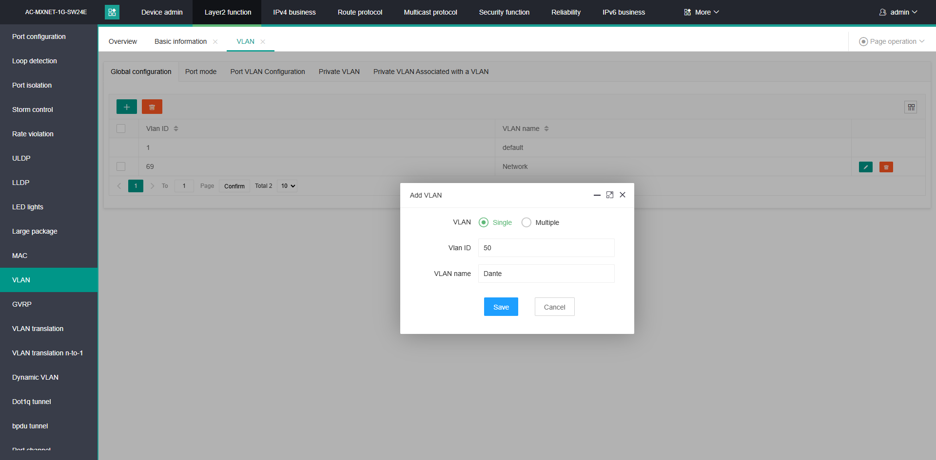 Step Seven: Navigate to the 'Dynamic VLAN' subtab within the left navigational bar. Click on the 'MAC VLAN' subtab at the top, and then click the Plus (+) icon. Within the Vlan ID field's dropdown menu, input the VLAN ID for the Dante VLAN, and click 'Save'. The VLAN ID will populate in the visible table.