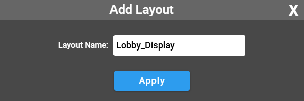 Click the ADD layout button located at the top of the Layouts panel. You'll be prompted to name your new layout. Enter a descriptive name without spaces (use underscores or hyphens if needed, such as "Lobby_Display" or "Control-Room-View"). Once named, your new layout will appear in the layouts list below the control buttons.
