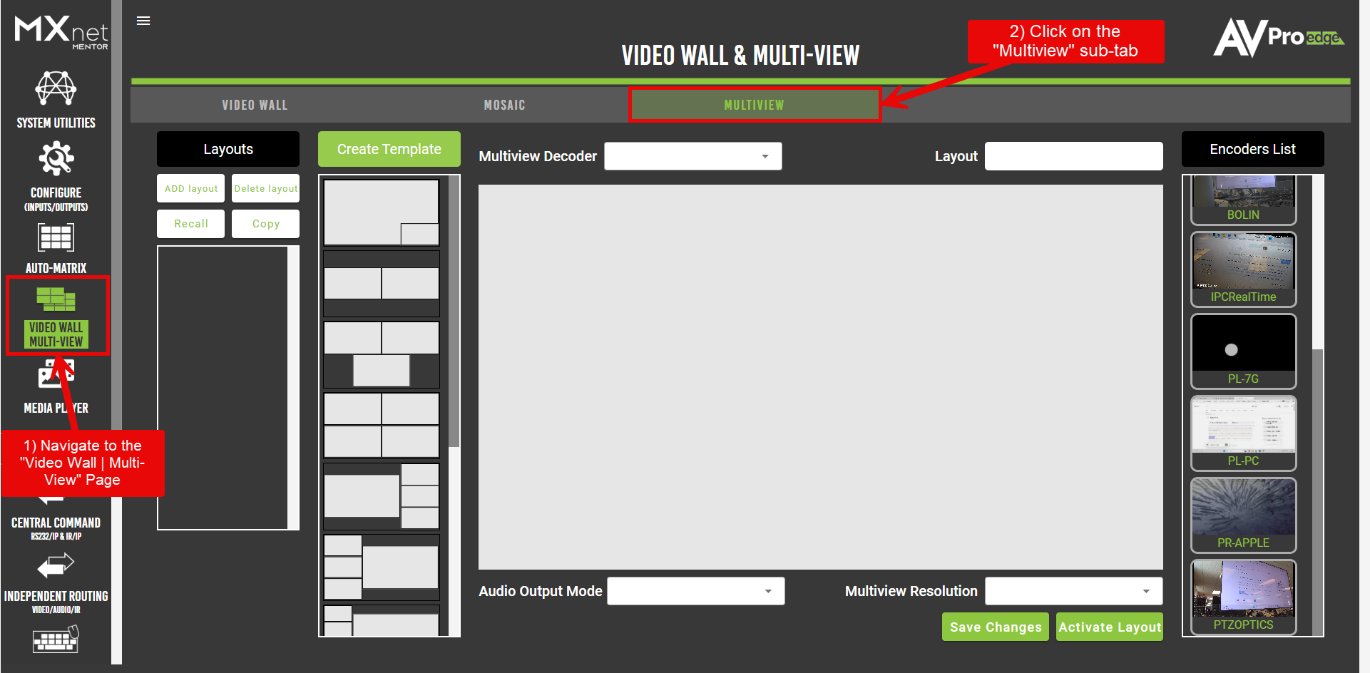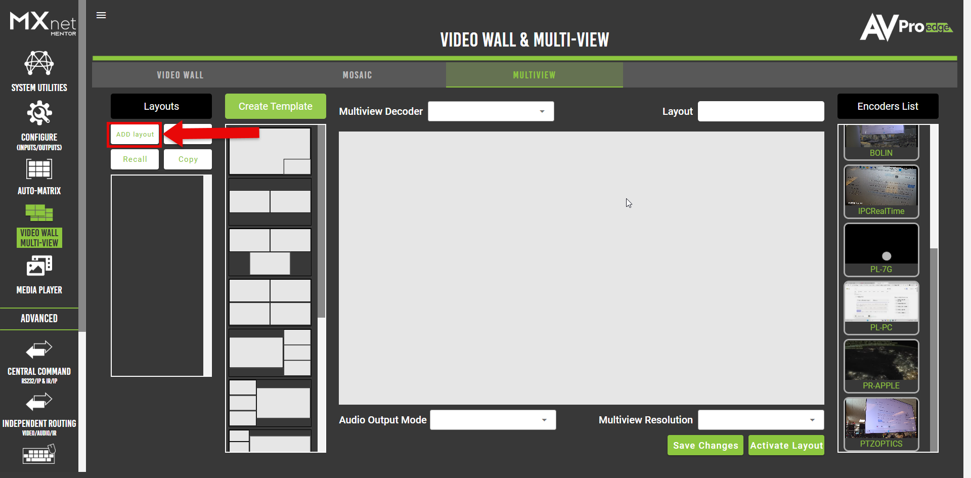Navigate to the MULTIVIEW tab in the Video Wall & Multi-View section of the web interface. The interface is divided into several key areas: the Layouts panel on the left, template selection in the center-left, the layout canvas in the middle, and the Encoders List on the right.
