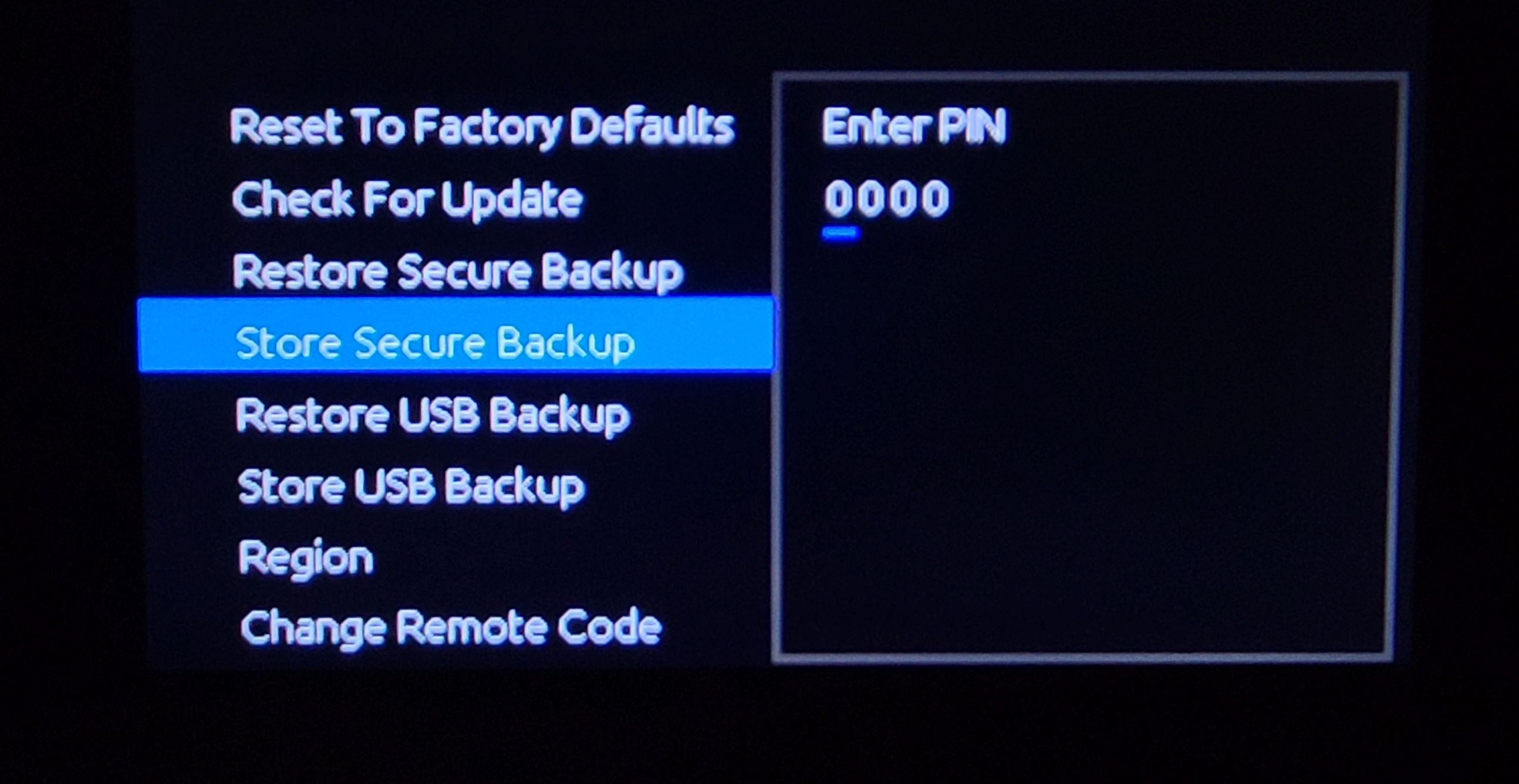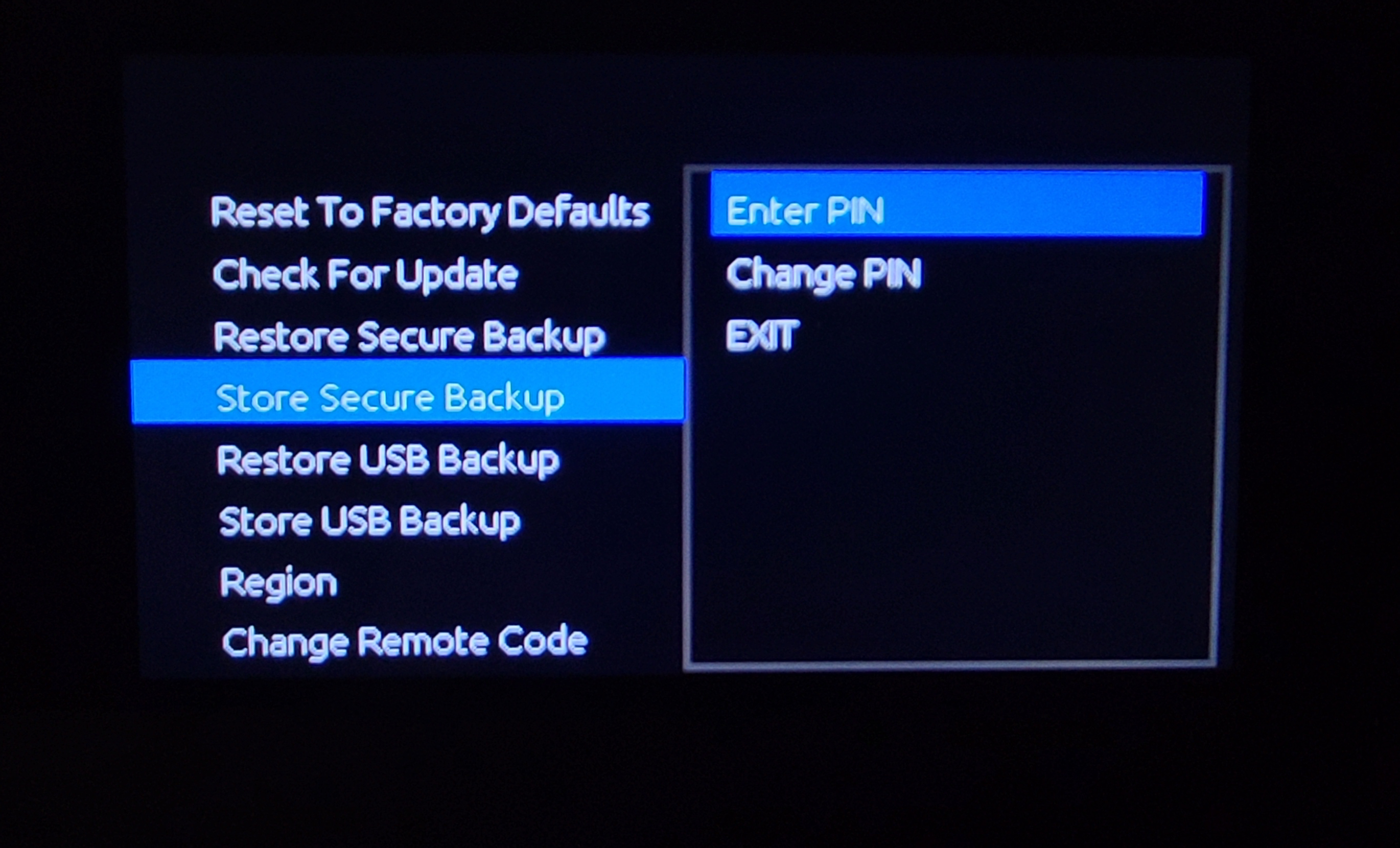 To save a backup of your settings before resetting, scroll down to Store Secure Backup and press Select. On the window that pops up, scroll up to Enter Pin and press Select.