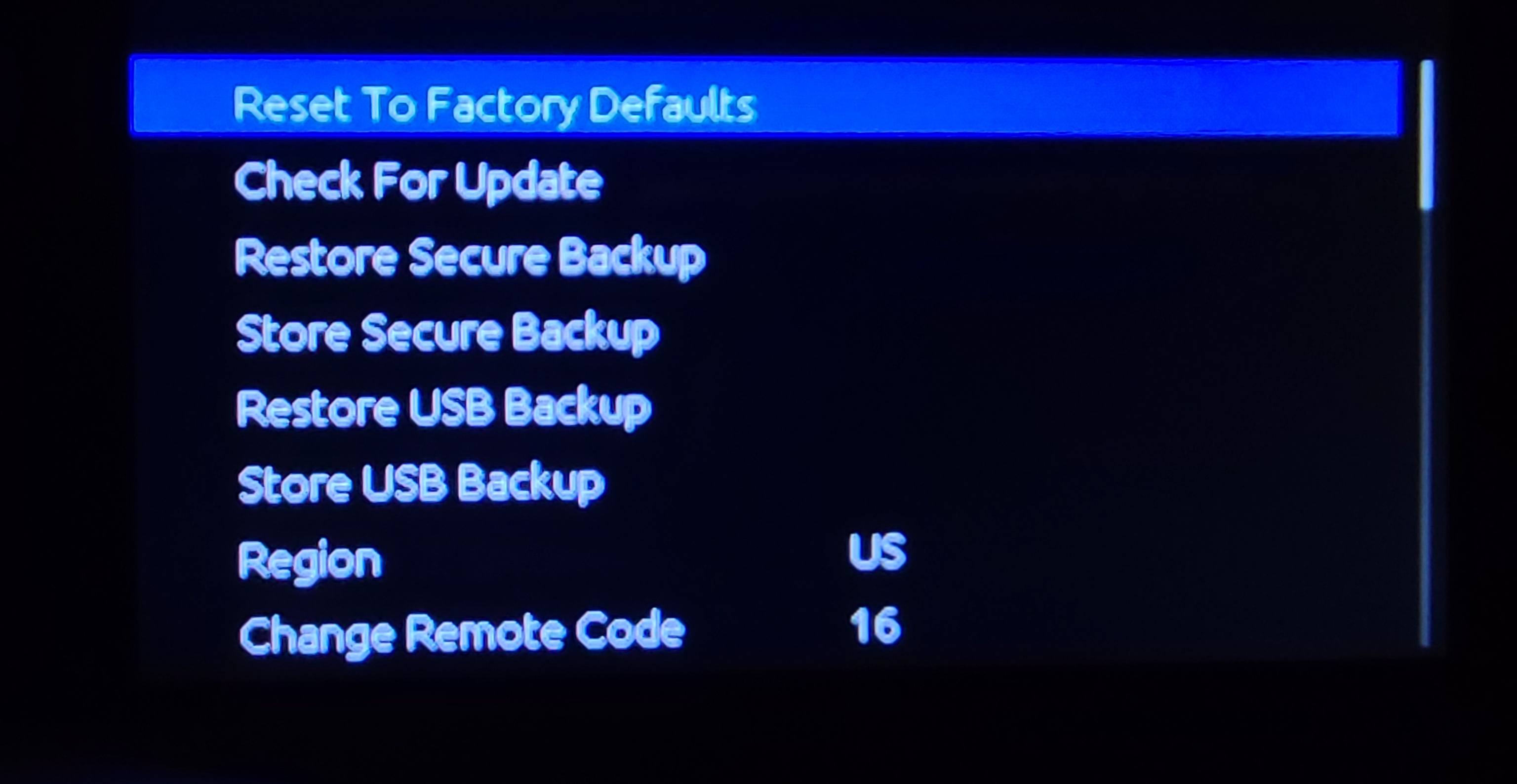 The first option on the menu is Reset to Factory Defaults. select this and follow the prompts on screen and the unit will go into standby. When it's woken up, it will be reset to factory defaults.