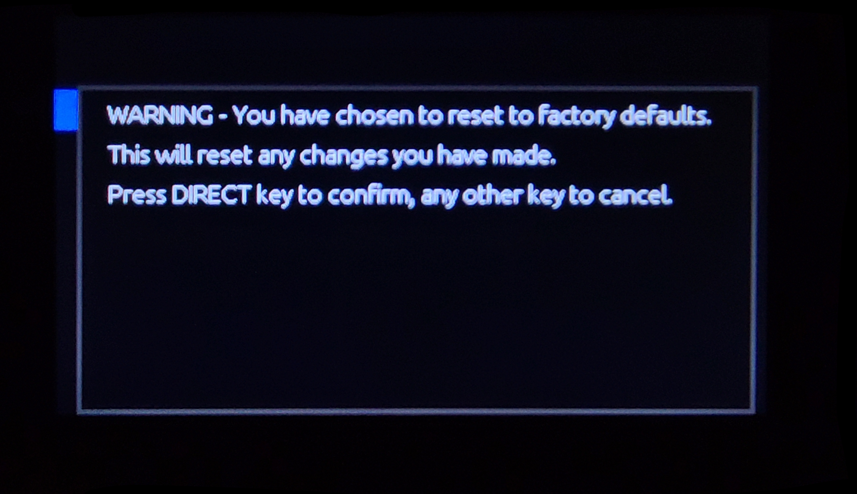 You can select Reset to Factory Default, then press the Direct key to initiate the factory reset. The unit will go into standby, and will be at default settings when turned on.
