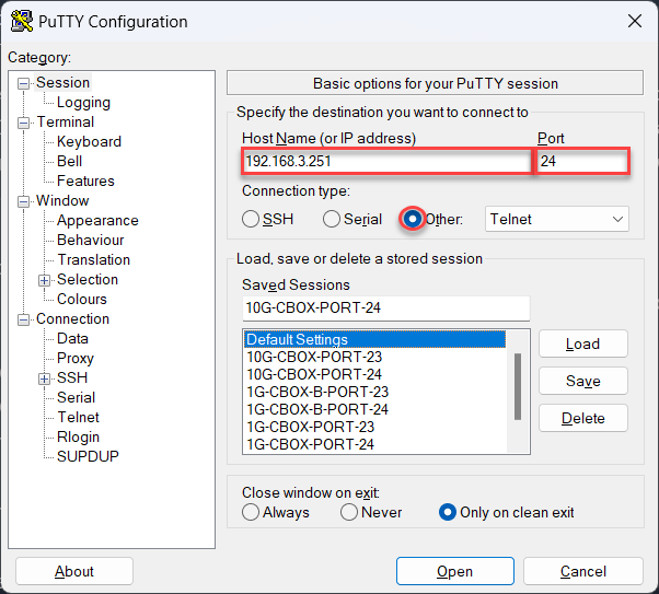 below represent a connection to the Cbox through Telnet using PuTTY.