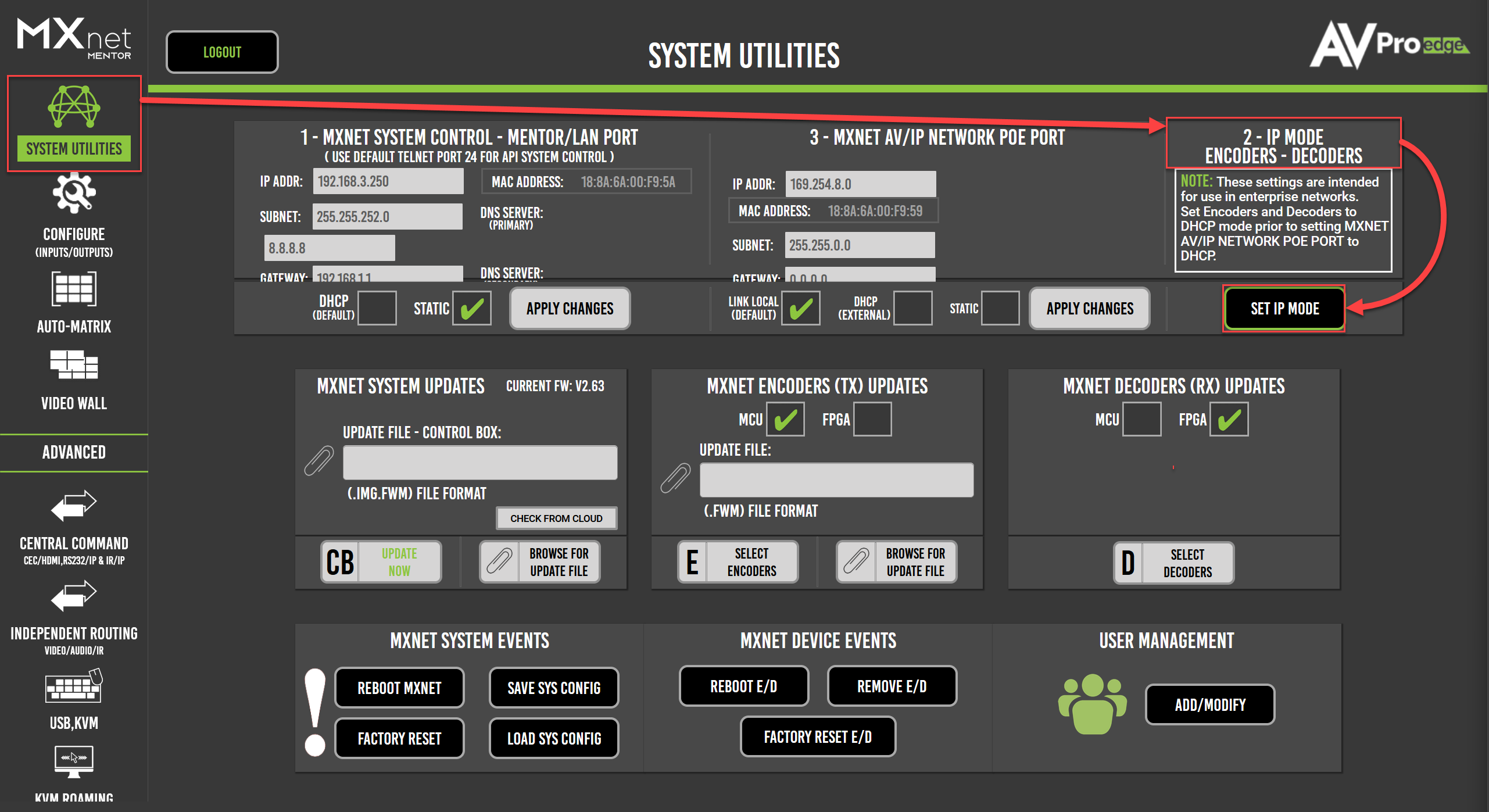 6. Find configuration block #2 called IP MODE ENCODERS - DECODERS. Click on SET IP MODE