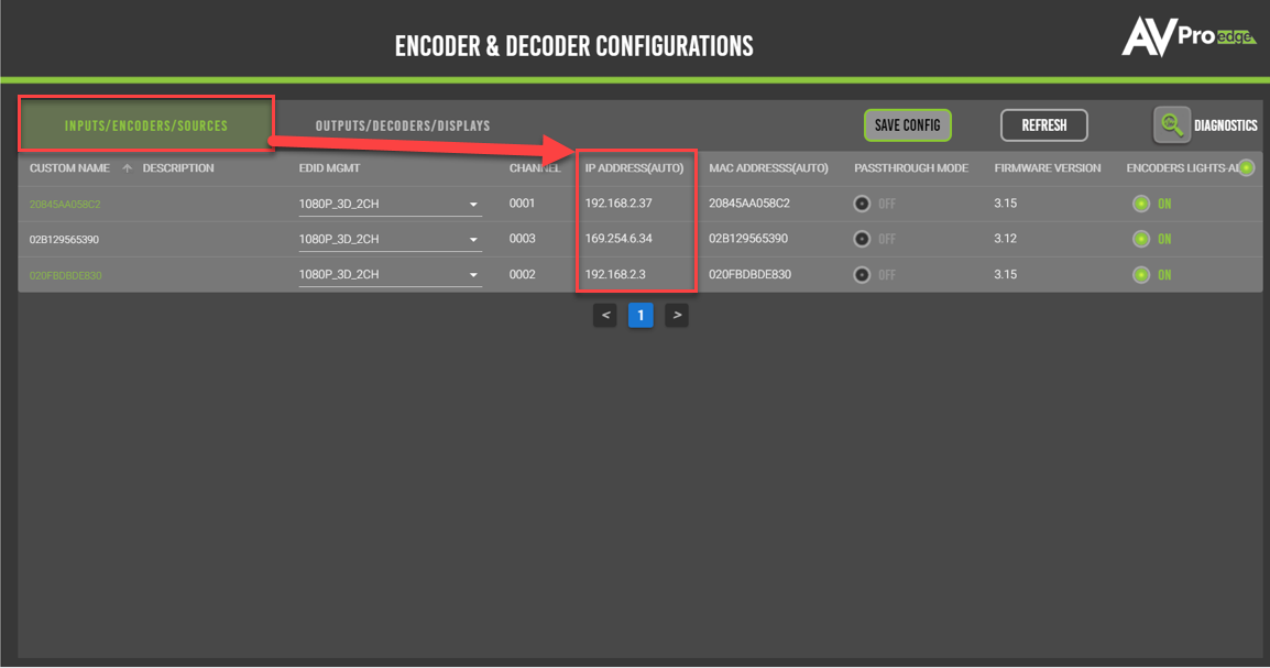 10. Under the INPUTS/ENCODERS/SOURCES and the OUTPUTS/DECODERS/DISPLAYS tabs, the encoder and decoder IP addresses can be found under the IP ADDRESS(AUTO) column. Ensure the end points have a valid DHCP address and the CUSTOM NAME is green indicating the end point was discovered and is controllable by the Cbox.