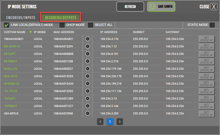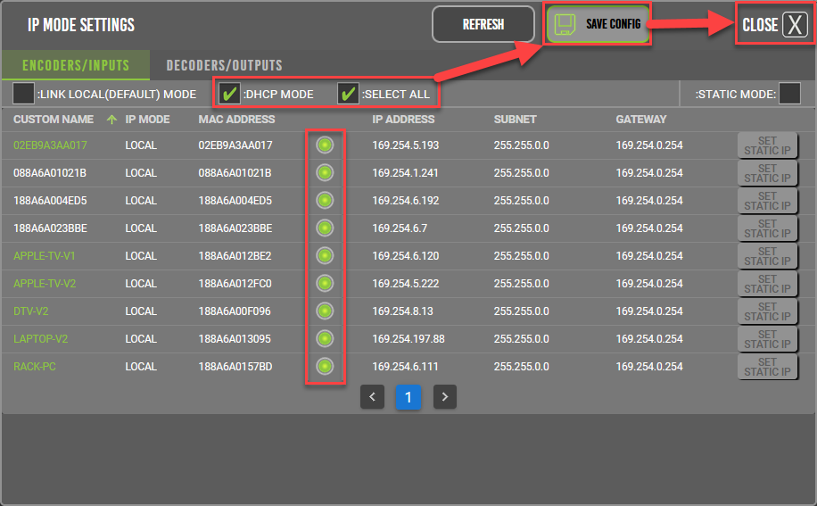 7. In the SET IP MODE menu, click in the DHCP MODE and SELECT ALL mode check boxes. Confirm a green check mark is now visible in both check boxes and the radio button next to each end point changed from dark grey to green. Press the SAVE CONFIG button and the CLOSE button to save the changes made, apply this change, and exit the SET IP MODE menu.