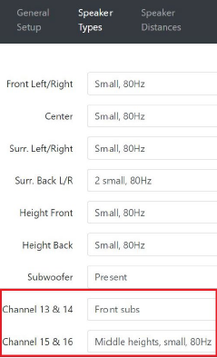 Channels 15/16 can be used for two additional subwoofers OR a third pair of ATMOS speakers (Middle Height) OR for an Auro3D/Center Height speaker.