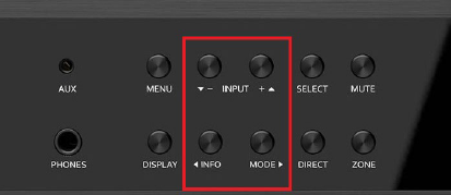 Note on Front Panel Setup Menu Navigation – Use the “Input + [up arrow]”, “Input – [down arrow]”, “Info [left arrow]”, and “Mode [right arrow]” buttons to navigate to the various menu options. To select a menu option press the SELECT button. Press the Menu button anytime to exit the menu screens and any setting changes will be saved automatically.