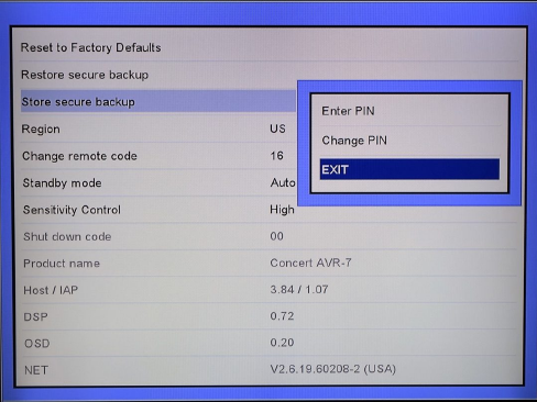 Once you select the STORE A SECRURE BACK UP, a pop up window will show up > select “Enter PIN” > the default password is “0000” and should be auto populated > so it is just a matter of pressing the SELECT button on the front panel (or the OK button if you are using the AudioControl IR remote control to navigate these menus).