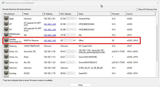 • Verify the correct MAC address is entered in the RTI driver settings after