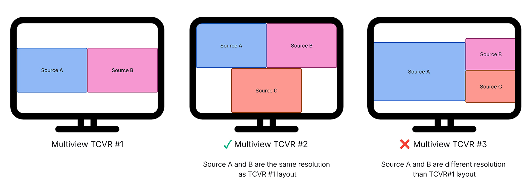 With 10G series, multiview uses a sub-stream generated from encoders. This sub-stream is scaled based on the size of the window in the multiview layout. The main stream and scaled stream combined cannot exceed a total video throughput limitation of 4K60 4:4:4 8bit (498 MPixels/sec). Additionally, if the design is using multiple decoders to process different multiview layouts, sources shared between these layouts must be the same resolution.