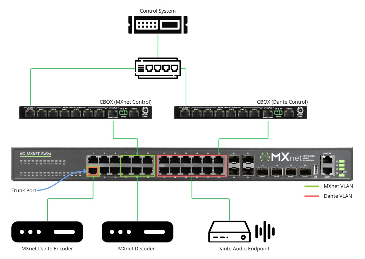 Dante & AES67 rely on precise timing via PTP clocking and very low jitter. Using VLANs prevents video traffic from interfering with audio traffic and ensures cleaner network timing with low-risk for dropped packets. Below is a example system design that incorporates an MXnet VLAN and a Dante VLAN. The MXnet Dante encoder is connected to a Trunk port which separates MXnet video and Dante audio traffic into two VLANs.