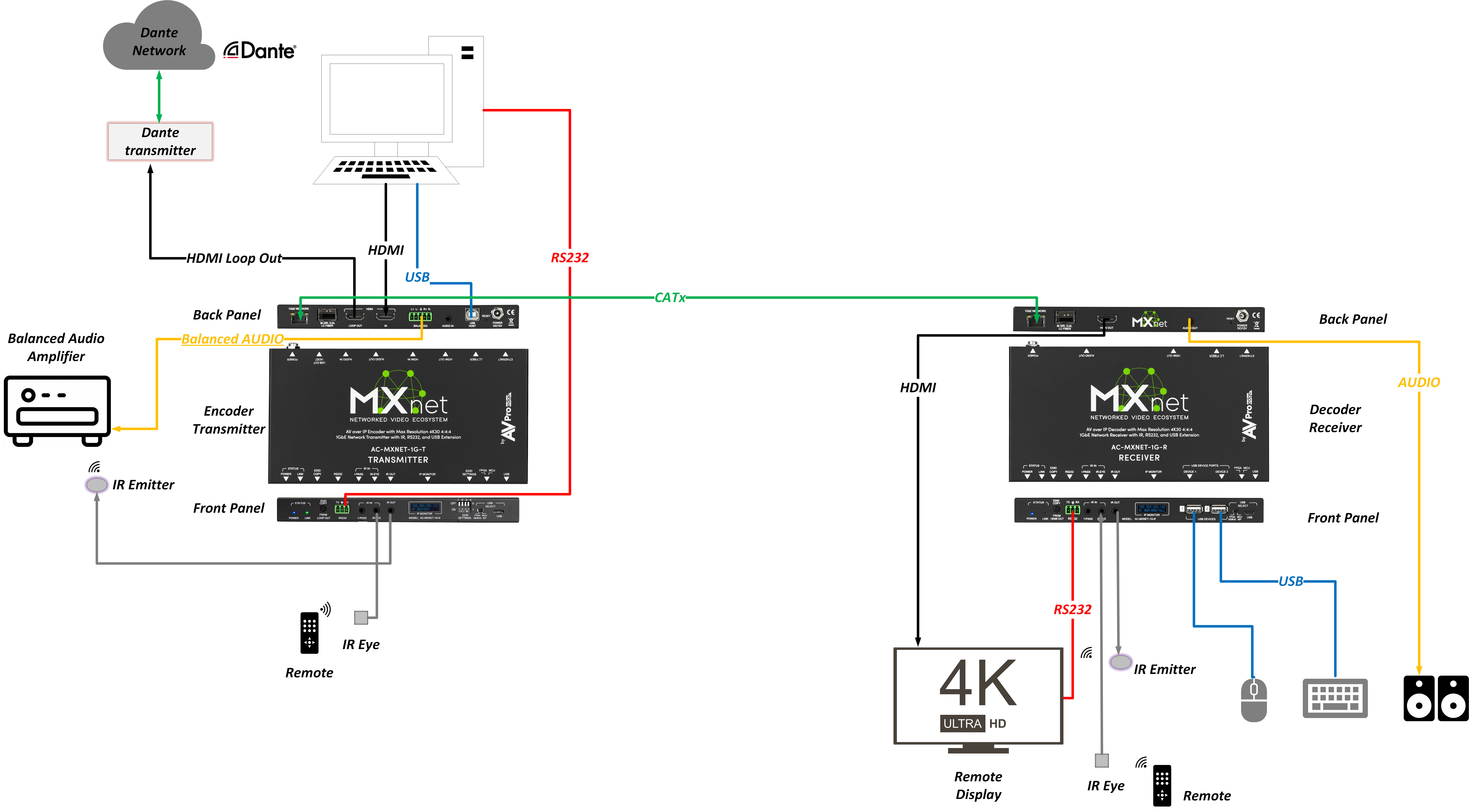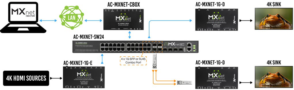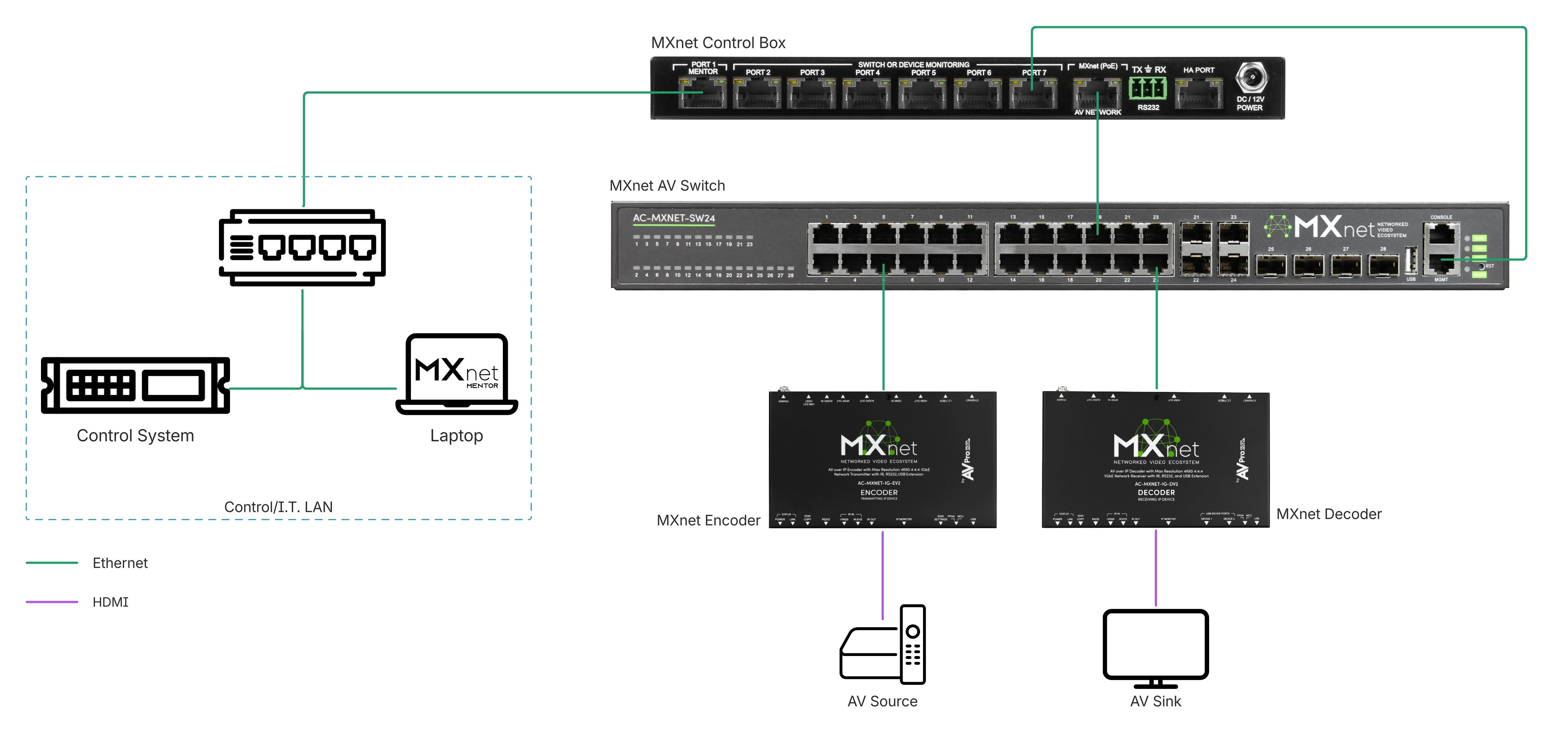 The diagram below shows a generalized system topology that incorporates the essential components for building an MXnet system. This includes an MXnet AV switch, encoders, decoders and a CBOX.