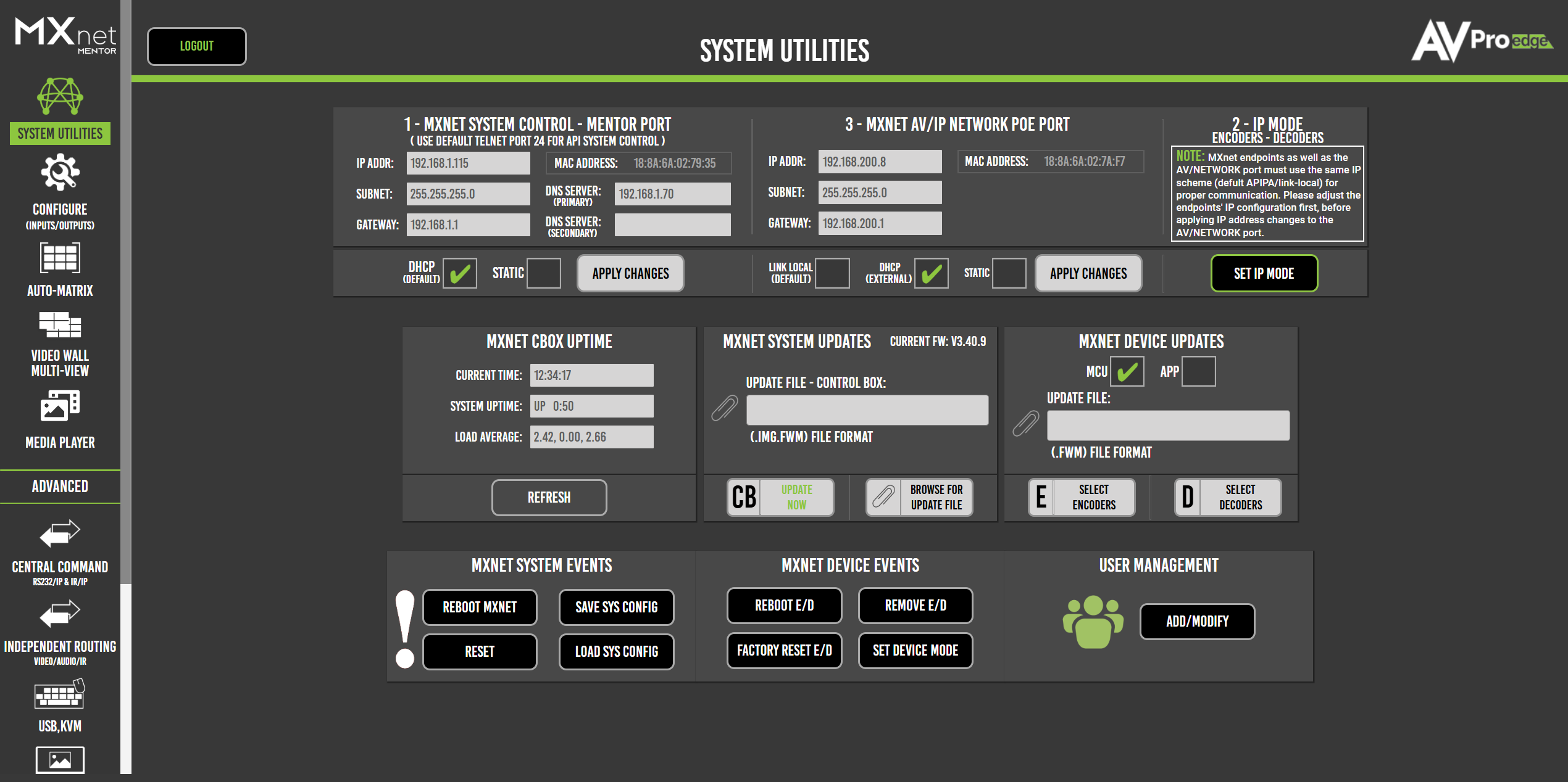 Mentor is the web-based management interface that is hosted on the CBOX. It is used to discover, setup and maintain all MXnet endpoints. To access Mentor, you must type the IP address of either the CBOX Control or AV port into your web browser based on which LAN your computer is physically connected to. By default, the CBOX Control port is set to DHCP and the AV port is set to link-local APIPA. If a DHCP server is not available, the control port will fallback to a link-local APIPA address within 169.254/16. The front panel of the CBOX-HA features a "DHCP" button. Press and hold this button to force the control port to a static IP address of 192.168.1.239/24. IP addresses of the CBOX can be found on the front panel info display.