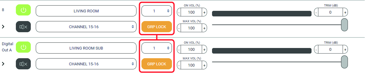 Your group will have at least 2 zones: One zone for the mid and high-frequency speakers, and a second zone for the subwoofer. Assign the amplified zone and the digital output the same group number, and engage the GRP Lock for each zone.