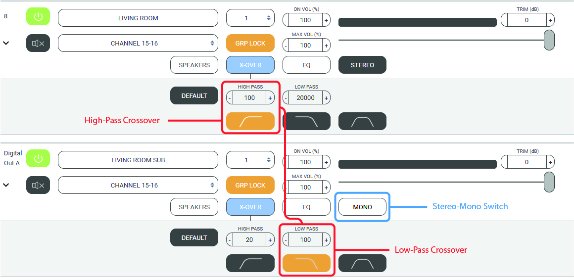 Next, set the crossover for your zones. The amplified zone should have a high-pass crossover and the subwoofer should have a low-pass crossover. If your subwoofer has a built-in crossover, leave the crossover in the web interface set to default. Finally, change the digital output from Stereo to Mono.